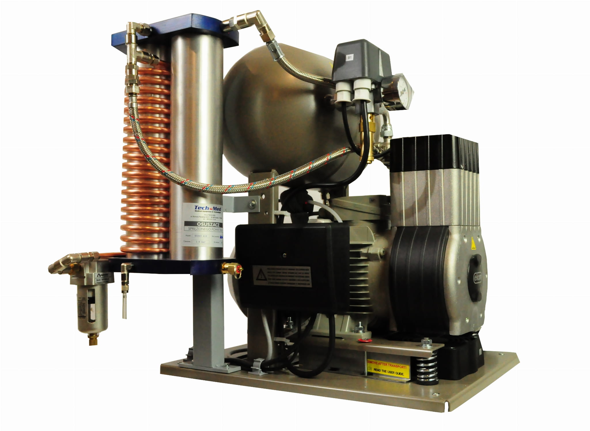 Jego niewielkie gabaryty pozwalają na instalację w przypadku gdy kompresor znajduje się wewnątrz w gabinecie.