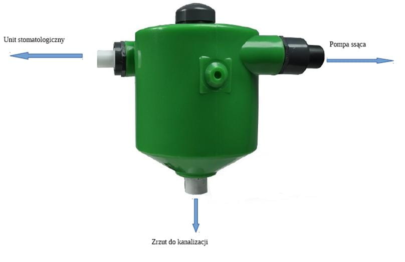 Zbiornik separacyjny służy do oddzielenia mieszanki cieczy od powietrza podczas pracy ssaka w gabinecie stomatologicznym. Zbiornik może pomieścić 3,5 l cieczy co pozwala na jednostajną i długą pracę bez konieczności